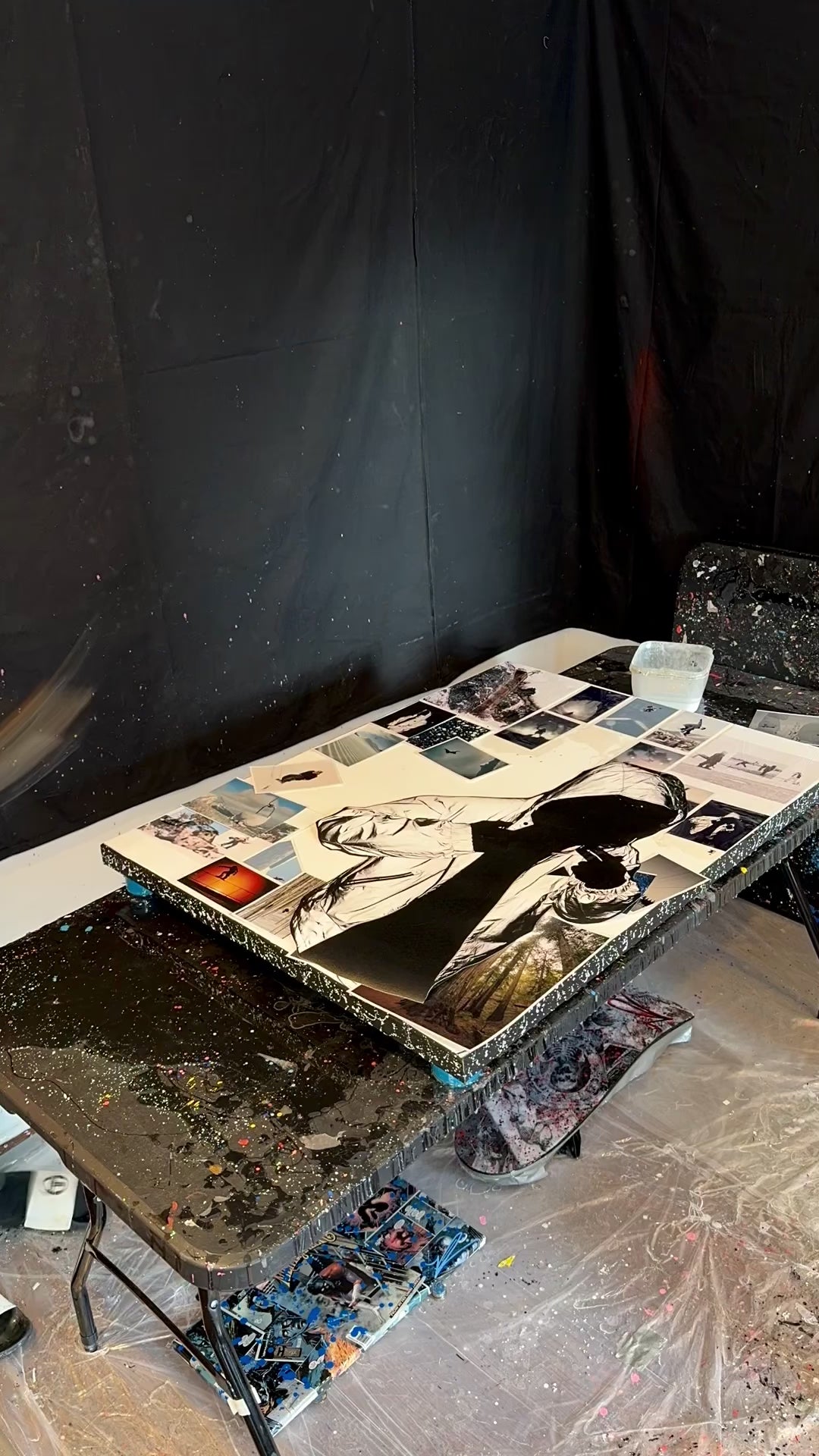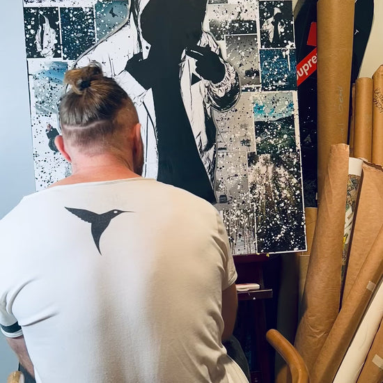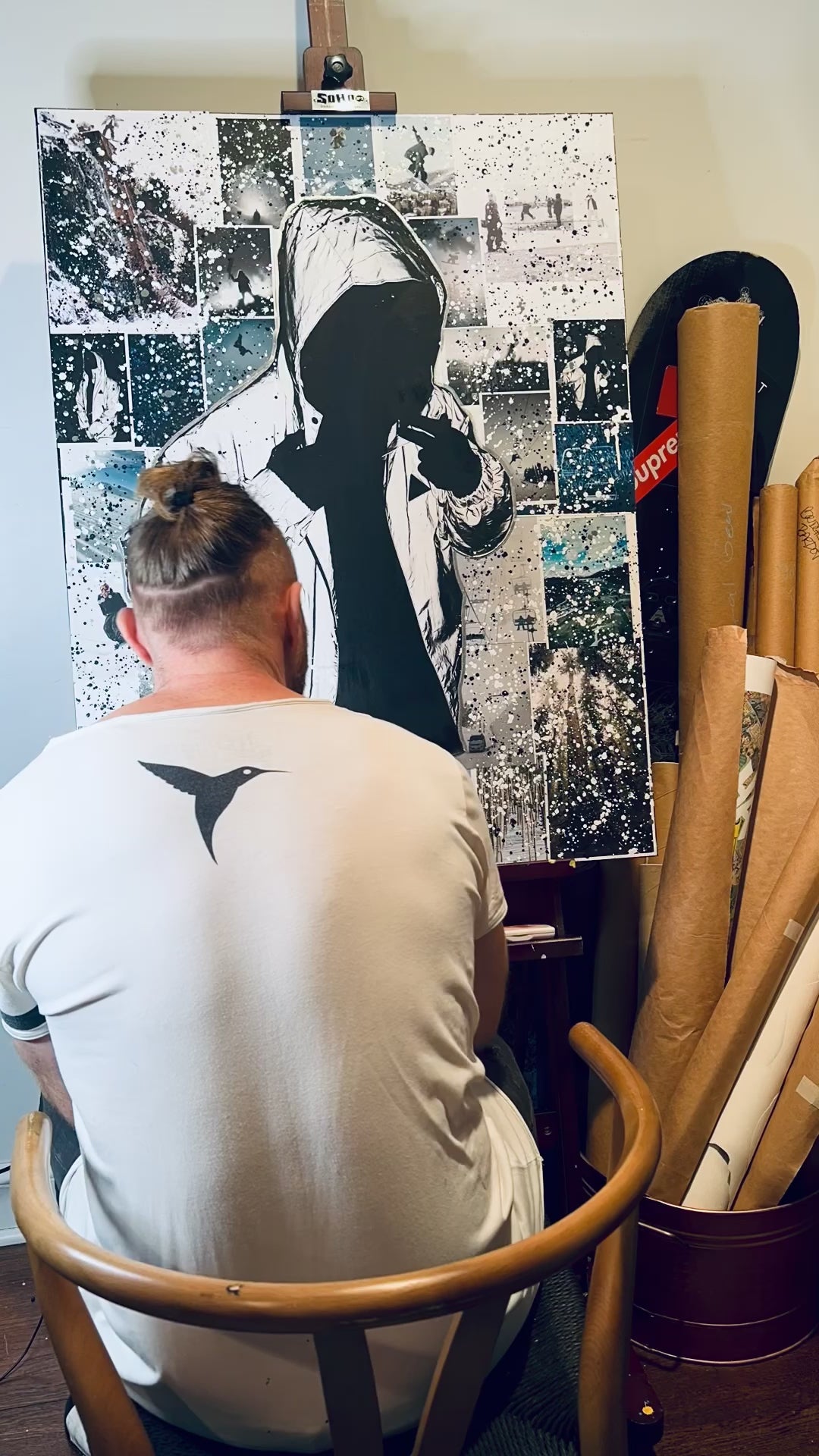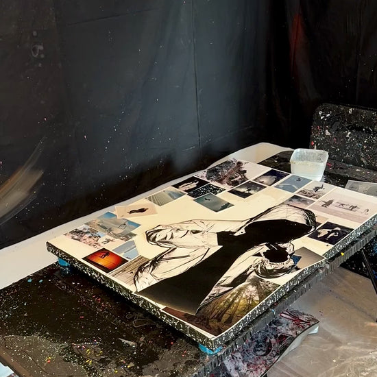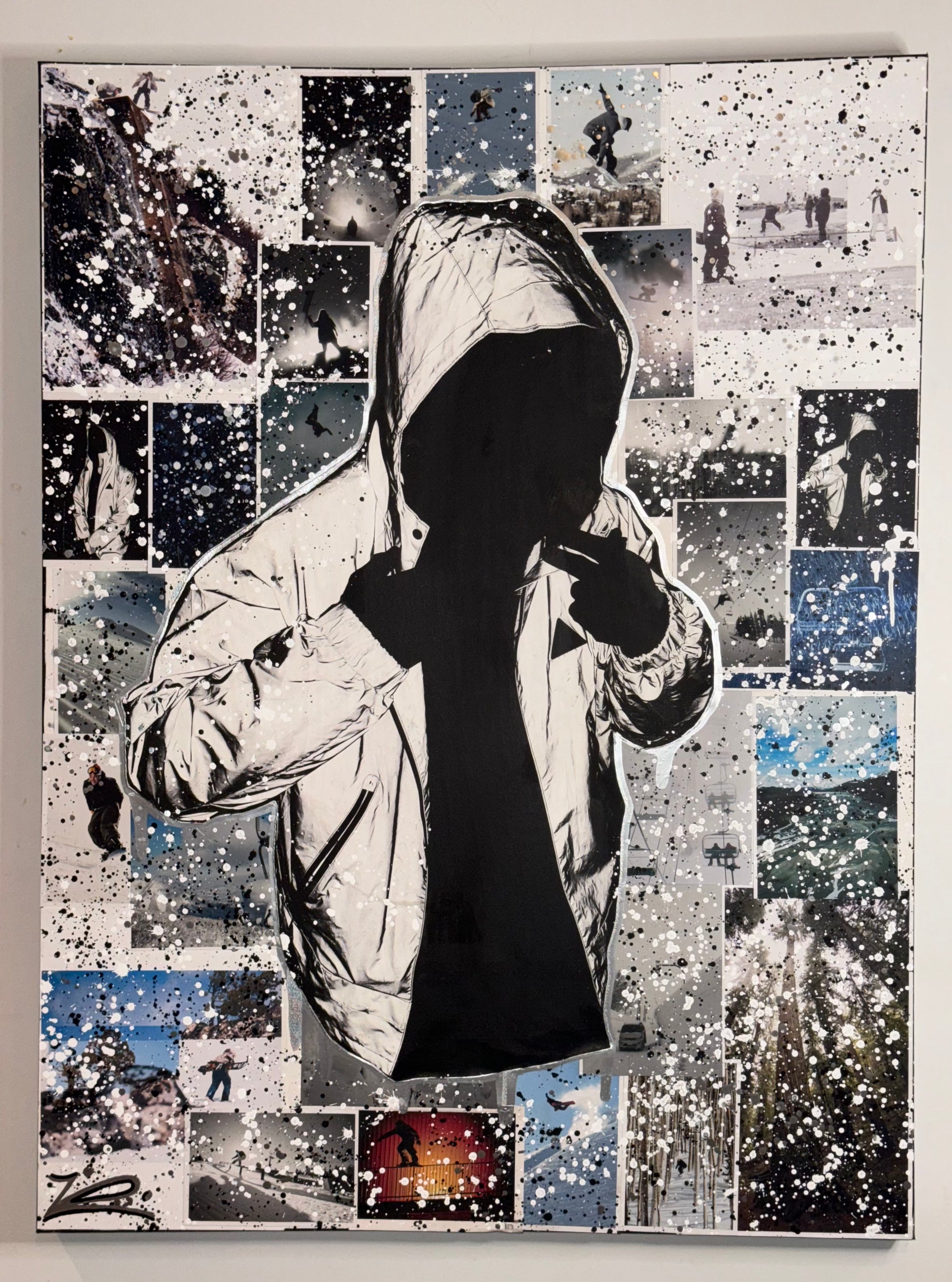 This visual avalanche layers his stunning photography with my signature mixed-media approach. The monochrome palette reflects the stark brilliance of the mountains, while splattered paint mimics the unpredictable chaos of snowfall. The faceless figure at the center—cloaked, enigmatic—embodies the soul of the sport: nameless, fearless, forever in motion.